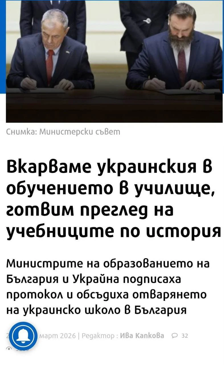 Ако сте имали съмнения, че сме колония, ето ви още едно доказателство за роболепието на управляващите ни еничари.Вчера министъра на образованието е подписал в Киев споразумение за изучаване на украински в българските училища! За сведение нацисткият режим на Зеленски ЗАБРАНИ изучаването на роден език в страната му, включително български за нашите сънародници в Бесарабия!!!!Тази еничарска сган, трябва да бъде изрината час по скоро!Идват избори.КРАЙНО време е за Възраждане. Това написа в профила си във Фейсбук Виктор Папазов.
